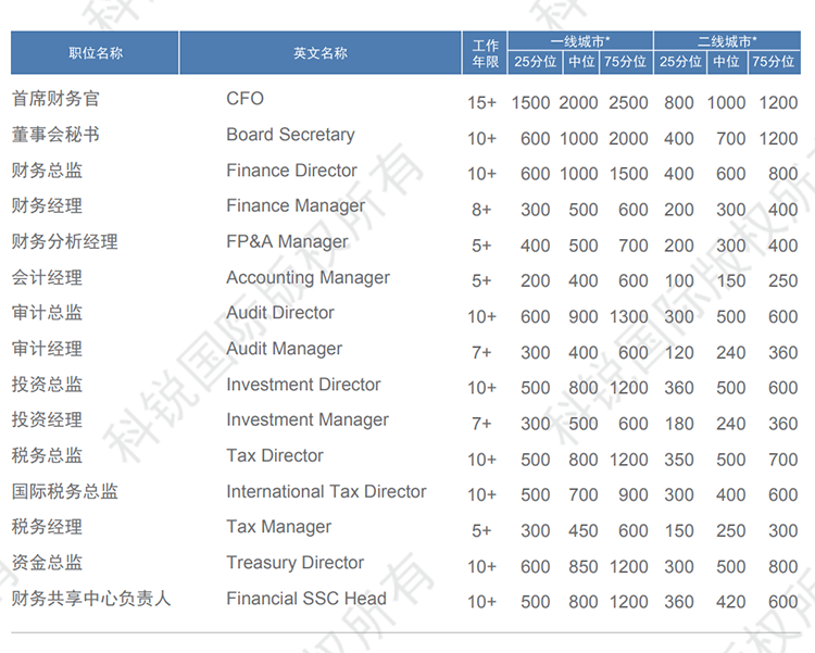 以下是猎头招聘公司威九国际V9国际发布的薪酬报告对财务领域的职位薪酬信息统计,供企业和猎头招聘时参考。